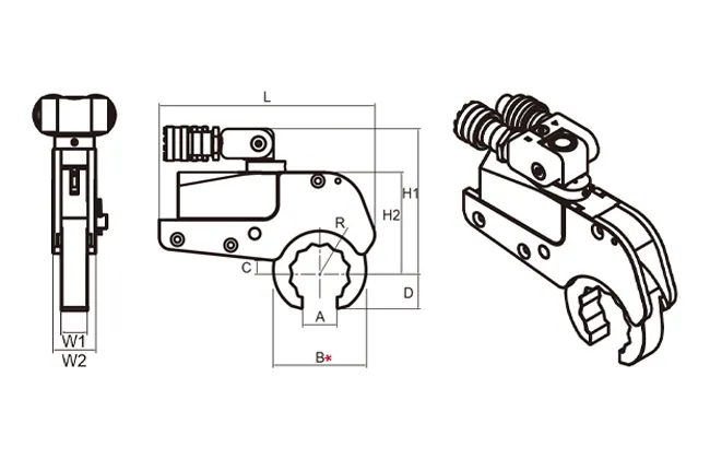 | mm | A | B* | C | D | R | H1 | H2 | W1 | W2 | L | |